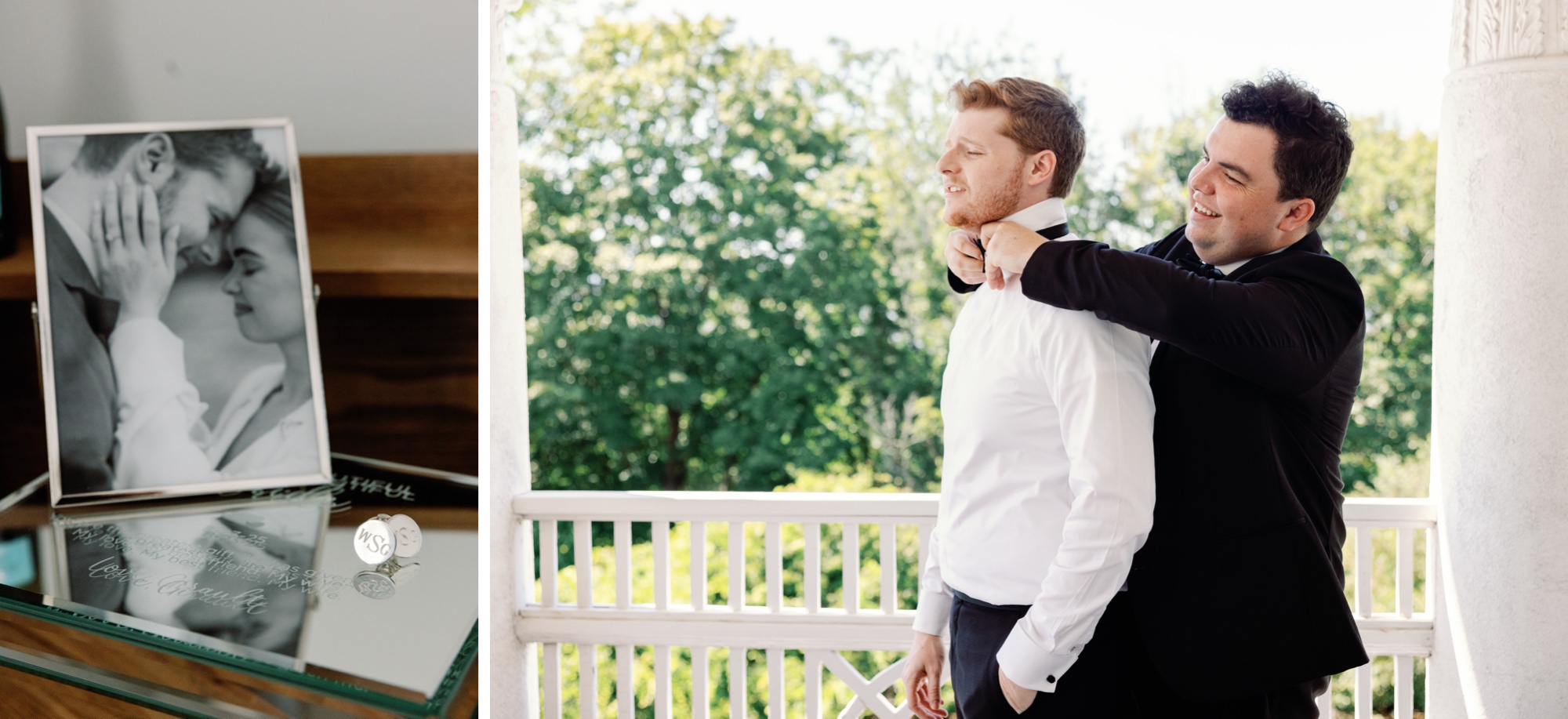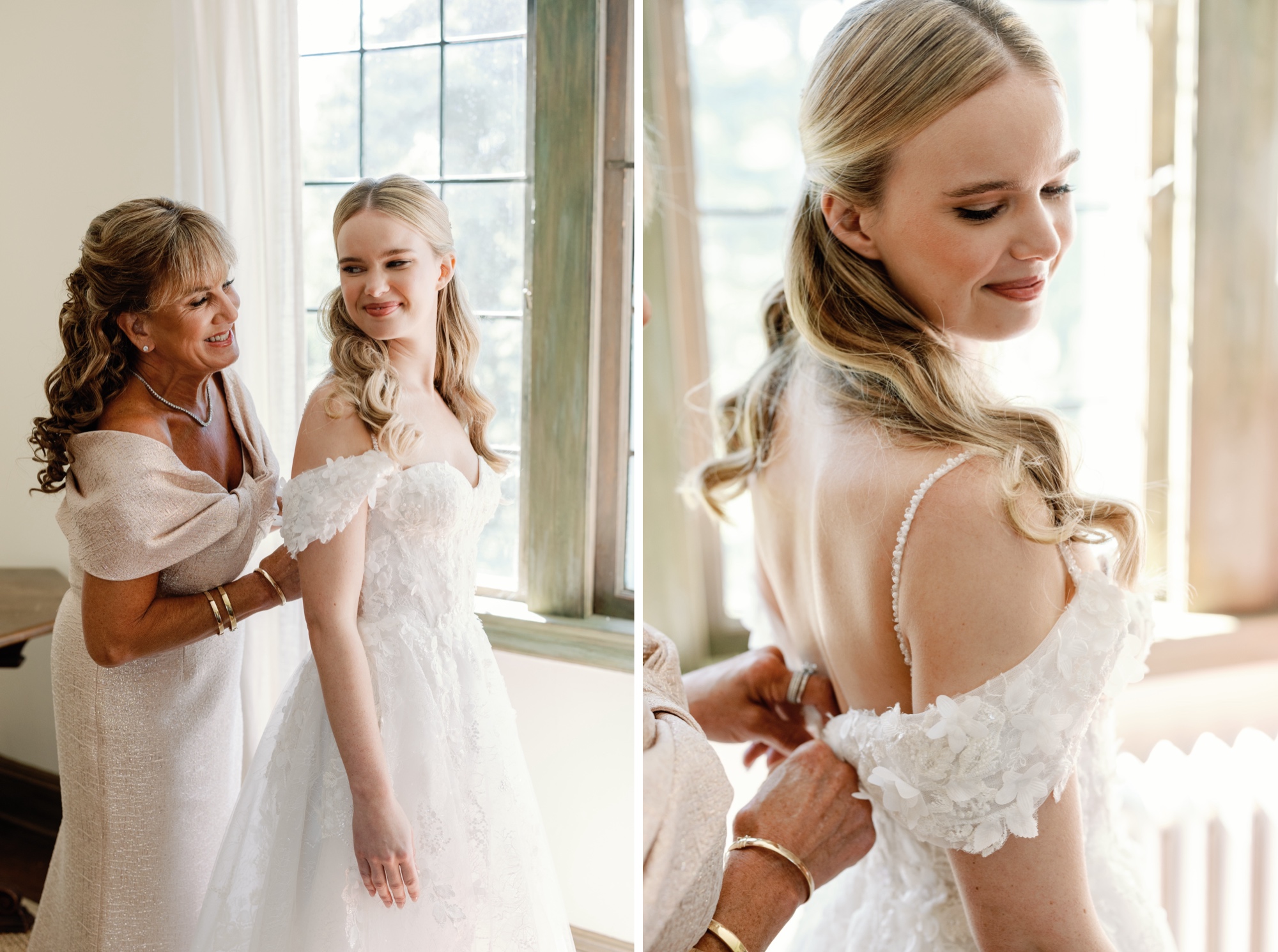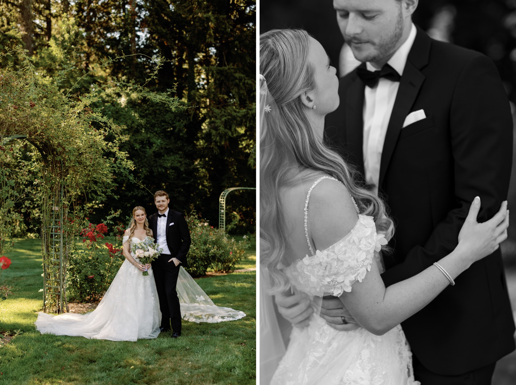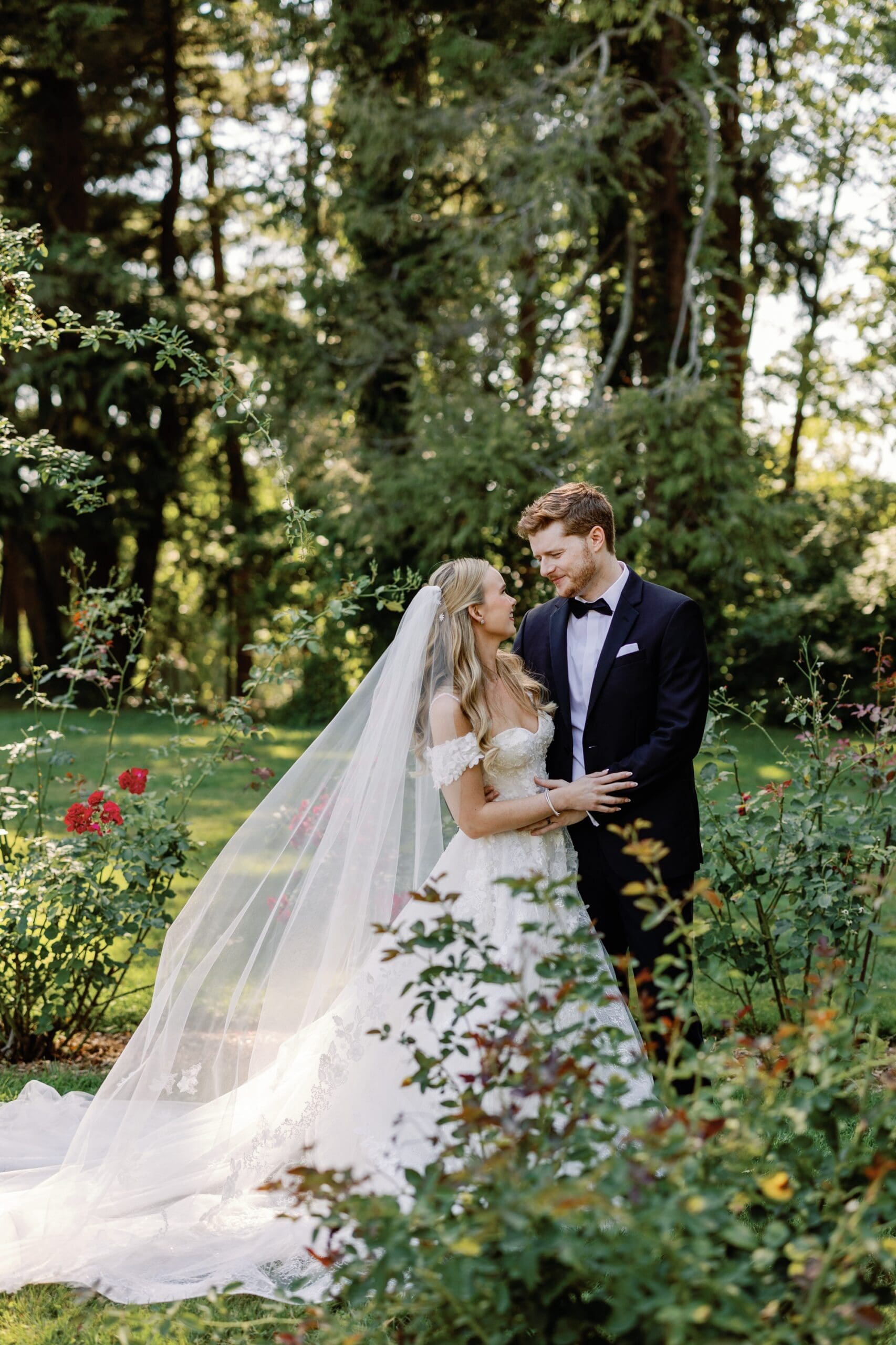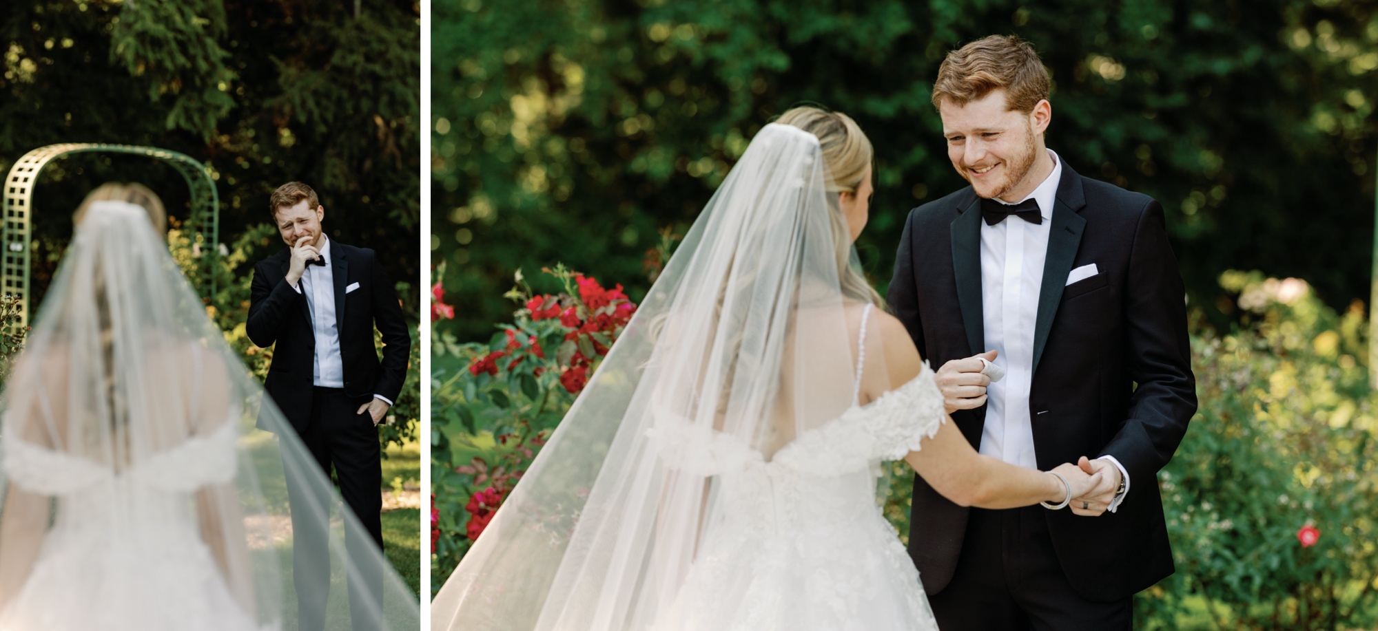 Alexa got ready just steps from the rose garden, which was in its second bloom of the summer (lucky us!!). She and Girault shared an emotional first look among the roses before we moved through the grounds for portraits—photographing in the rose garden, beneath the sweeping willow tree, and in front of the mansion itself before guests arrived.
