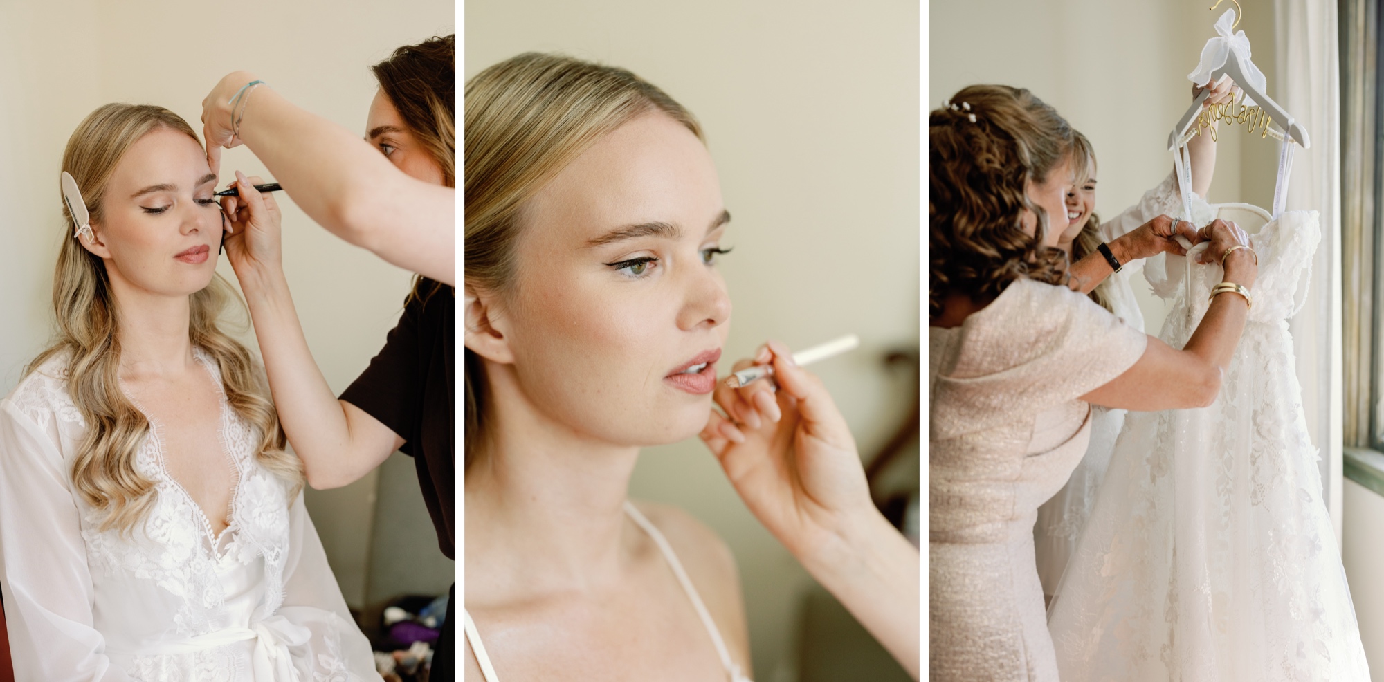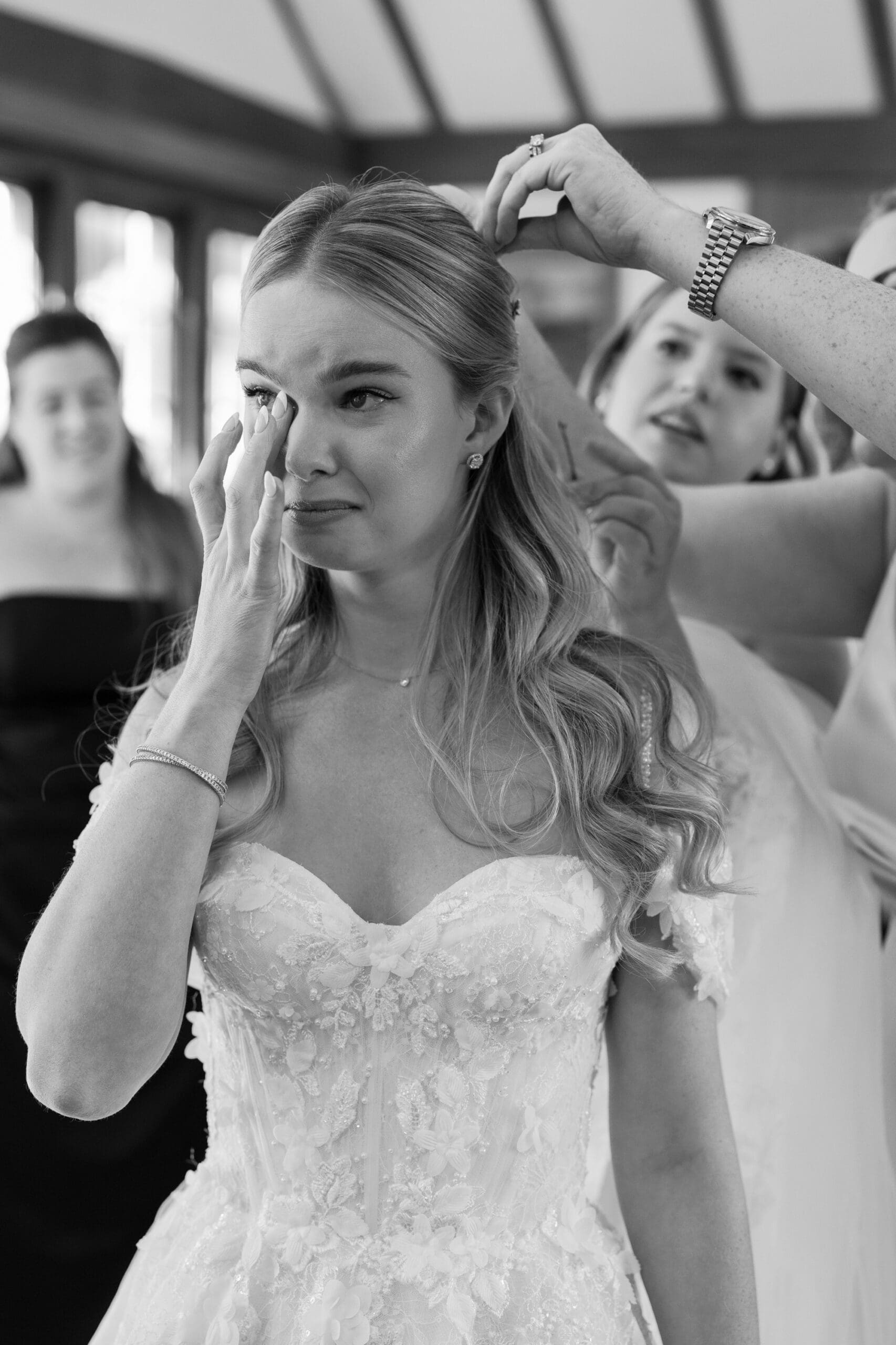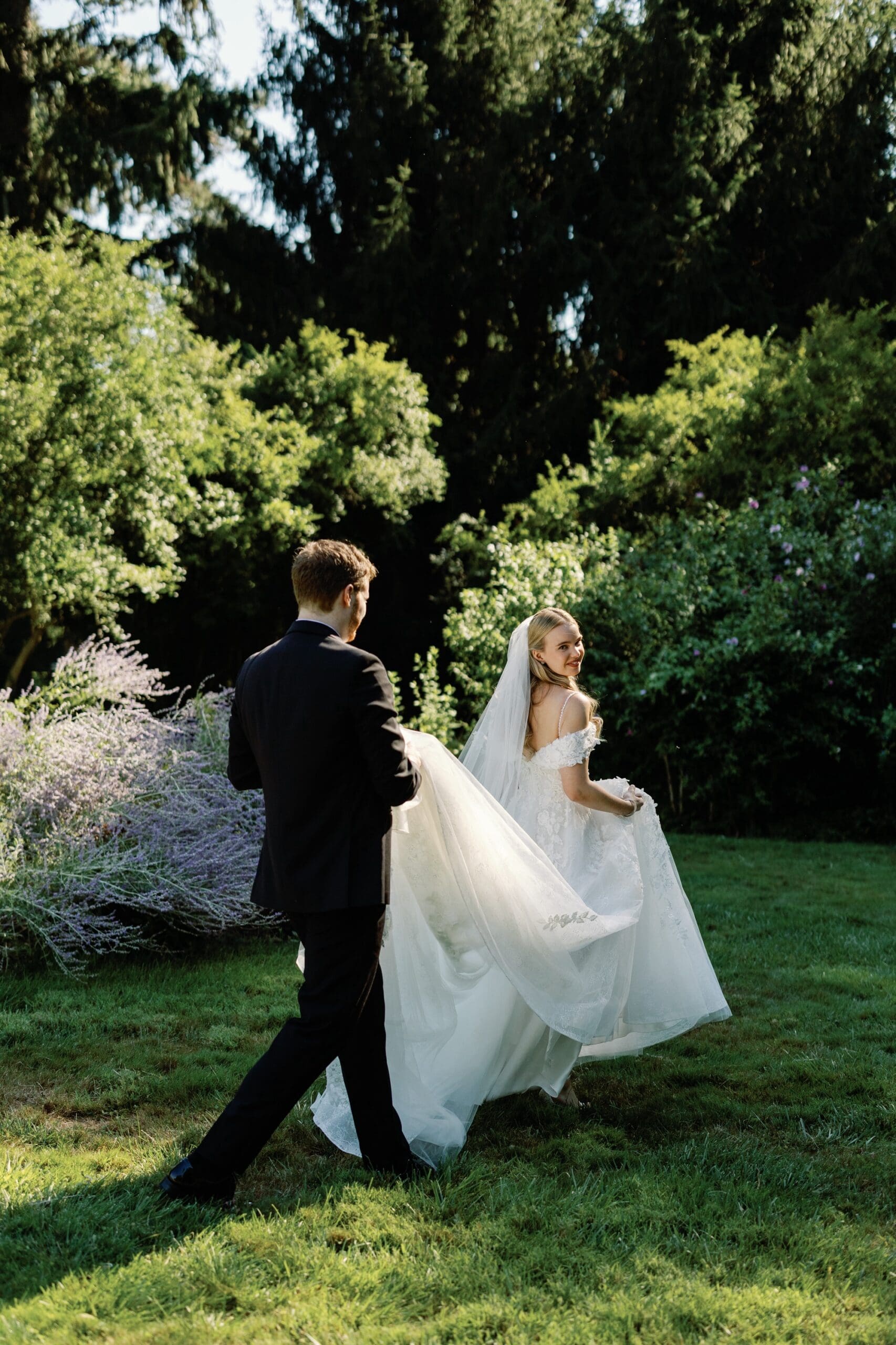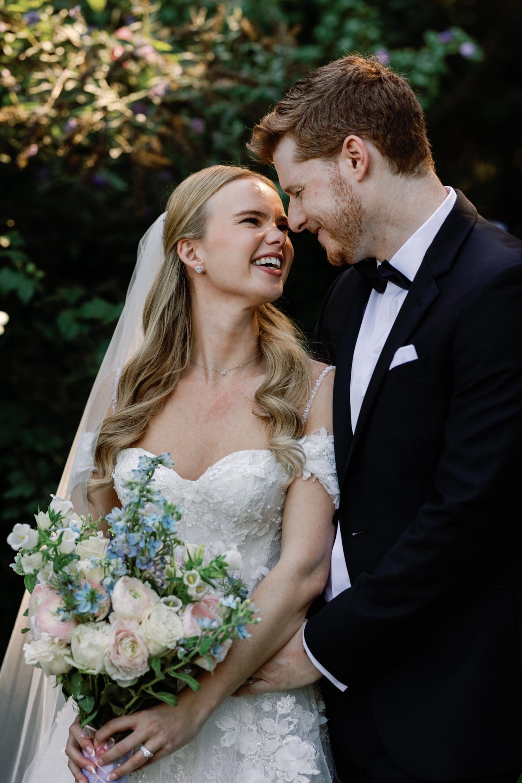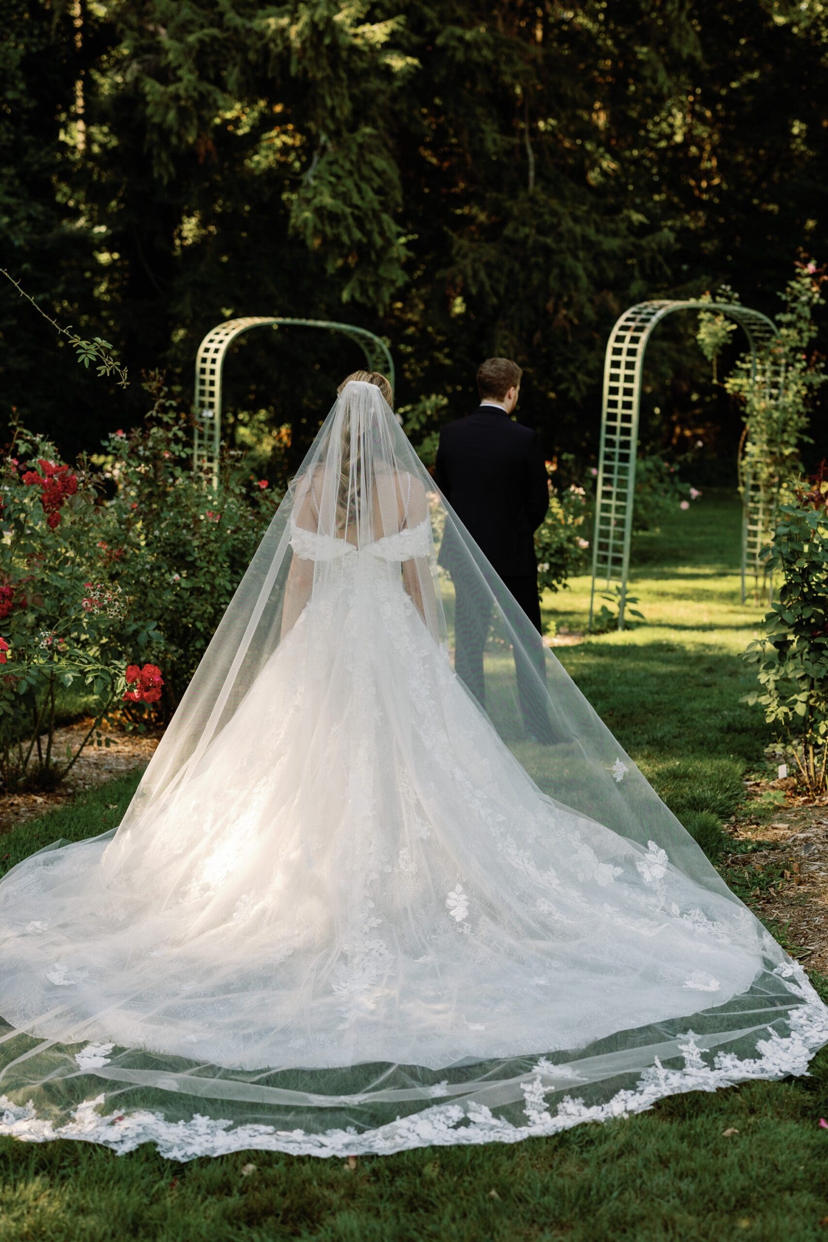 Alexa got ready just steps from the rose garden, which was in its second bloom of the summer (lucky us!!). She and Girault shared an emotional first look among the roses before we moved through the grounds for portraits—photographing in the rose garden, beneath the sweeping willow tree, and in front of the mansion itself before guests arrived.